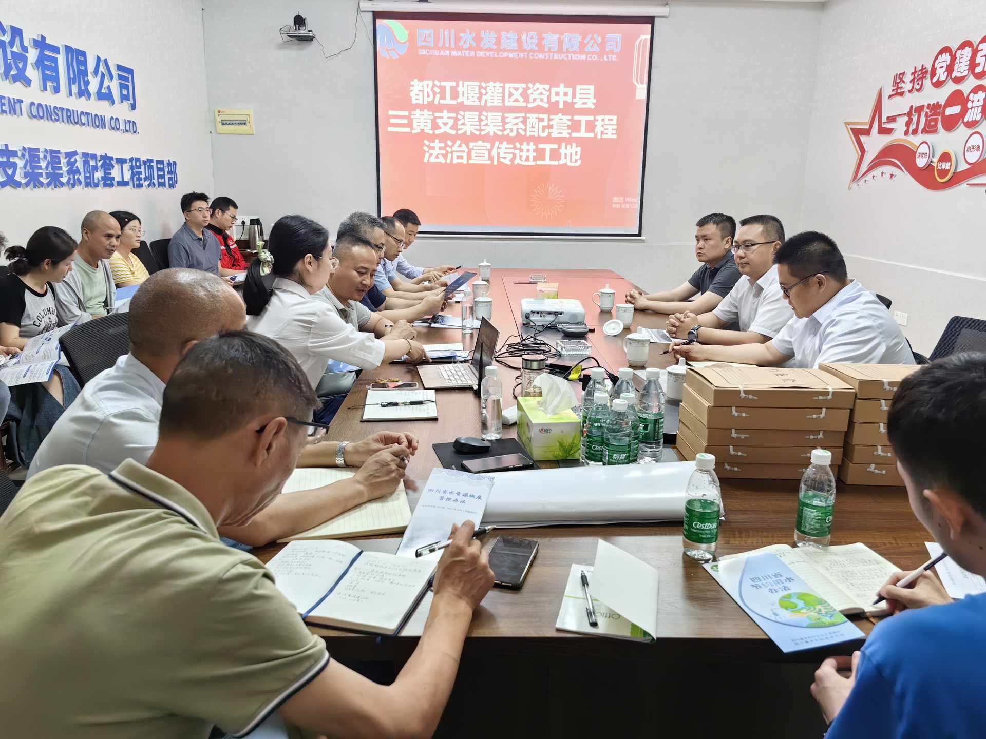 为进一步增强建筑企业和一线施工人员的法治意识和法治观念,5月14日,星欧娱乐 副总经理郑祖杰带队到建设公司都江堰灌区资中县三黄支渠开展“法治宣传进工地”普法宣传活动并主持召开座谈会,建设公司董事、总经理罗雪、星欧娱乐 审计法务部负责人等出席会议。