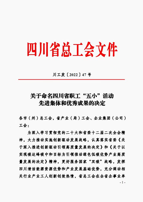 近日,四川省总工会命名了一批四川省职工“五小”活动先进集体和优秀成果。星欧娱乐 设计公司陈英、胡良文、单智杰、罗涛、滕毅申报的“一种由防冲墙组成的简易消力池结构”获得四川省职工“五小”活动优秀成果奖。