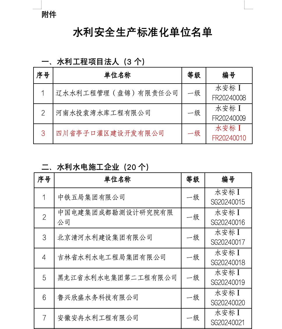 8月7日,水利部公布最新一批水利安全生产标准化一级达标单位名单,亭子口公司光荣上榜。水利安全生产标准化等级是体现水利生产经营单位安全生产管理水平的“国家级”重要标准,一级达标是水利行业安全达标的最高等级,本批名单中项目法人达标全国仅有3家单位。