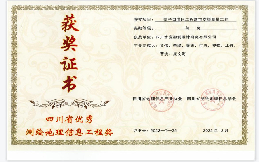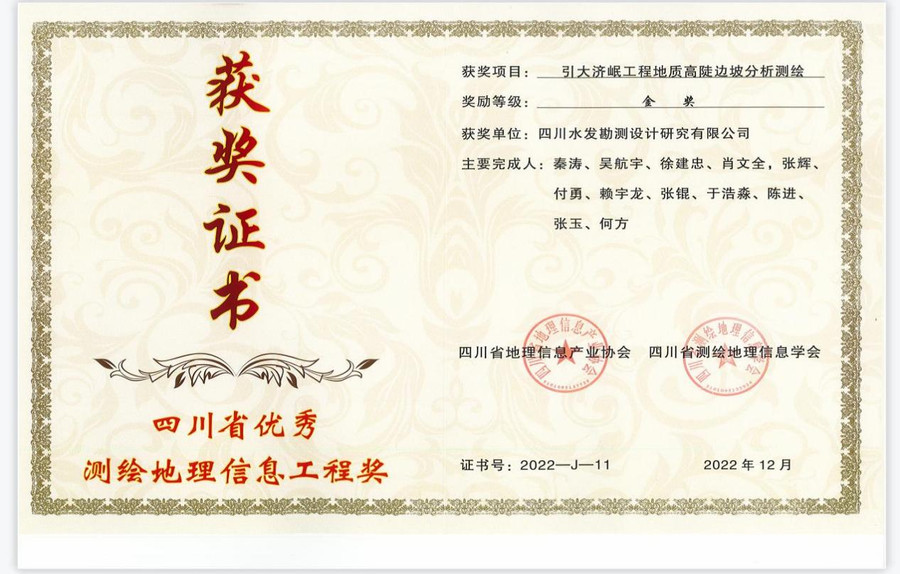 设计公司测绘分院完成的“引大济岷工程地质高陡边坡分析测绘”和“亭子口灌区工程新市支渠测量工程”两个项目分别荣获“2022年四川省优秀测绘地理信息工程奖”金奖和铜奖。
