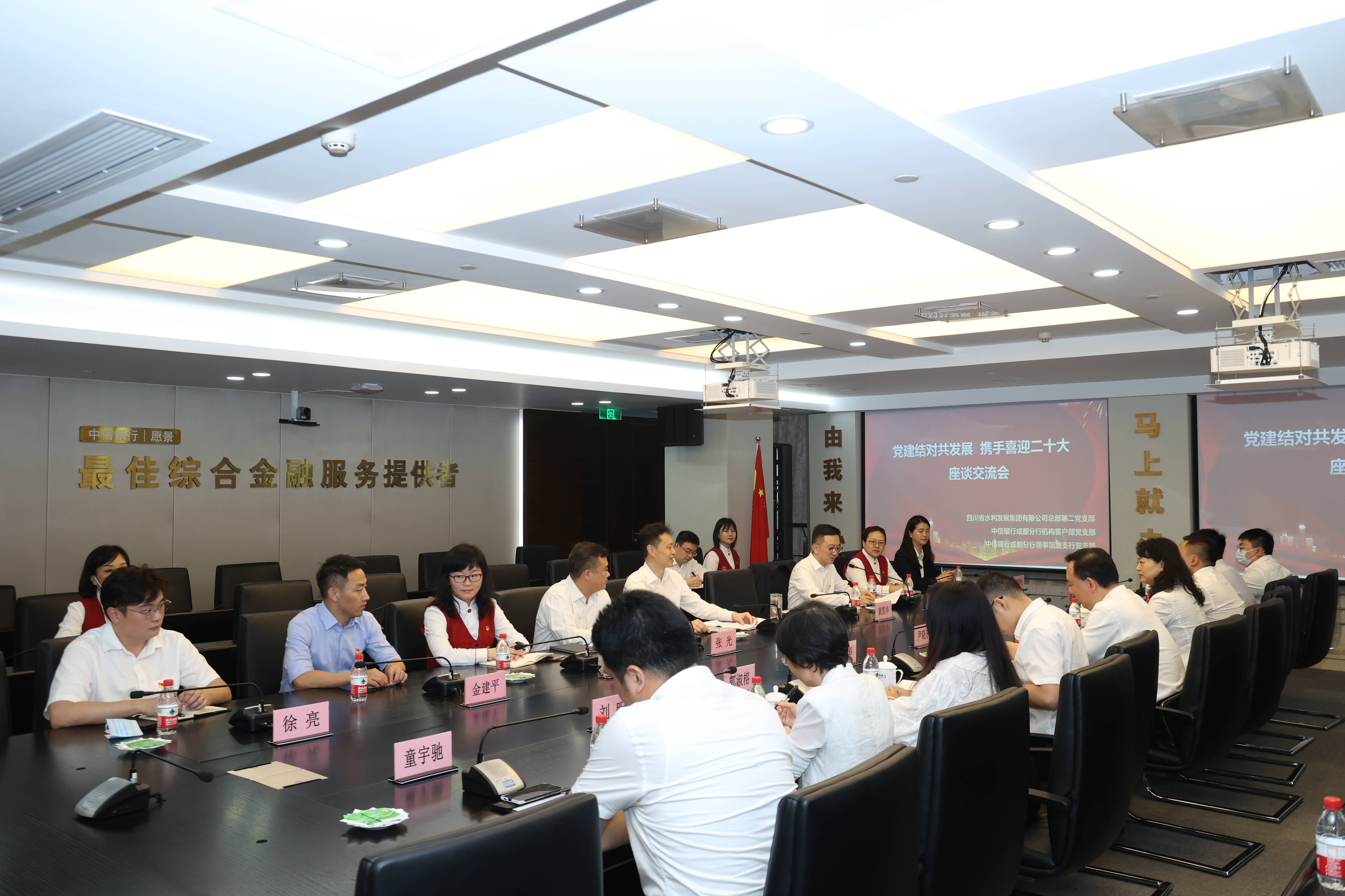 活动双方共同参观了中信银行成都分行行史馆,并以“党建结对共发展、携手喜迎二十大”为主题开展联合党建座谈会。双方围绕“党建引领星欧娱乐 水利事业”与“党建引领银企合作”进行了深入讨论与交流。中信银行支部以“成都公园城市新发展理念”、“展望中信”为主题进行了交流,星欧娱乐 二支部就“在党建引领下围绕四川水利事业发展凝心聚力,迎难而上”为主题进行交流。大家一致认为,我们一要深入学习贯彻习近平总书记关于国资国企改革发展和党的建设重要论述,二要深入贯彻落实中央、省委重要会议精神和全国“两会”精神及上级重大会议精神,三要认真学习宣传贯彻党的二十大和省第十二次党代会精神,以支部联合党建为契机,深入交流、相互借鉴、共同进步,落实国有企业党建工作的创新尝试,巩固深化全面战略合作关系,共铺服务之路、共绘发展蓝图。