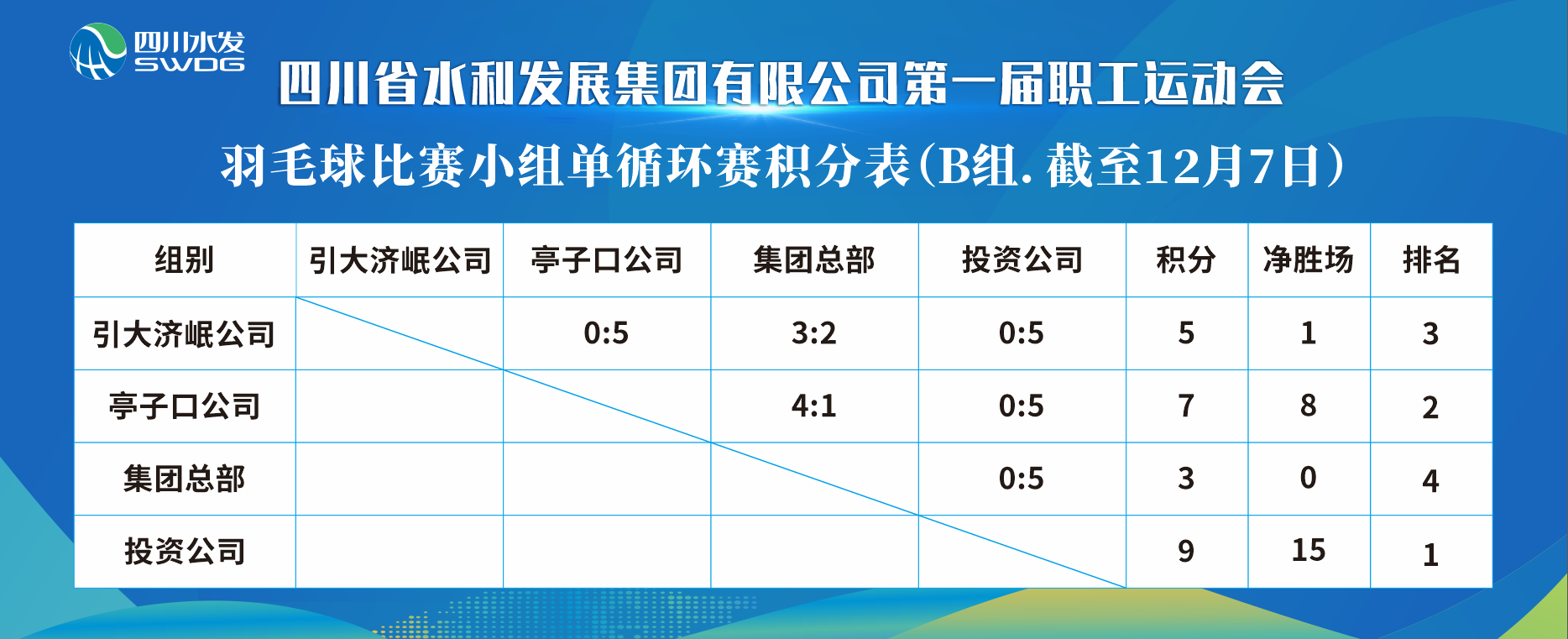 星欧娱乐 第一届职工运动会第3天,羽毛球小组循环赛及排位赛开赛,8支队伍在短短的一天时间里进行了15场比赛,向家坝公司获得本届运动会羽毛球混合赛团体第三名、亭子口公司获得第四名,12月9日将进行冠亚军争夺。比赛现场精彩纷呈、高潮迭起,选手们比战术、拼耐心,跳跃、反手、扣杀,行云流水的动作,充分展示了星欧娱乐 职工顽强拼搏、勇于拼搏、激情四射的精神面貌。
